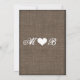 Rustic Country Mason Jar Burlap Imprimer Modèle avec fleurs de lavande violette dans un bocal en conserve enveloppé de dentelle avec les initiales de la mariée et du marié avec un coeur au sommet. Ces invitations uniques au mariage campagnard sont parfaites pour tous les mariages à thème rustique. Les initiales du couple et le coeur sont également au dos de l'invitation sur l'arrière - plan de design imprimé burlap rustique en détresse. bocal de mason, bocal de conserve, bocal de mason et dentelle, rustique, pays, en détresse, vieux, antique, vintage, mariage de grange, lavande violette, initiales, invitations de mariage de fleurs violettes, invitations de mariage mason jar, burals de mariées et initiales de mariées, lap, burlap look, faux burlap, gravure