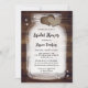 Invitations de douches rustiques personnalisées avec un bocal de mason et deux coeurs de burlap contre un arrière - plan de grange. Éléments correspondants disponibles.
