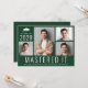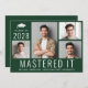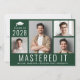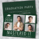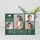 Une invitation à la fête de remise de diplômes de maîtres modernes avec un collage photo de 4 images, "Mastered It" écrit en grandes lettres majuscules blanches et son année de classe, nom et école ou université en simple typographie blanche. Au contraire, ajoutez les détails de la fête principale.