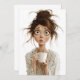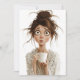 L'image représente une illustration fantaisiste et exagérée d'une femme aux yeux larges et étonnés, aux cheveux tourbillonnés dans un chignon désordonné, et aux taches de rousseur. Elle a l'air déconcertée et déroutée, tenant une tasse de café blanche dans les deux mains tout en portant un peignoir léger avec un motif floral. Son expression suggère qu’elle est soit choquée, soit submergée, peut-être après s’être réveillée ou avoir vécu un moment chaotique. Les traits exagérés, surtout ses grands yeux et son visage mince et expressif, ajoutent un ton humoristique et relatable à la scène.