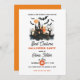 Les invitations à la fête d'Halloween Meilleur costume comprennent le château enchanté avec chauves-souris éffrayantes. Texte personnalisé en orange et noir.
