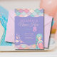 Un arrière - plan de couleur violet pâle, ressemblant à une surface lisse, légèrement texturée, est encadré par une bordure décorative avec un motif répétitif de formes colorées et superposées à l'échelle d'une sirène. En bas à gauche de l'arrière - plan, un amas de petits coquillages décoratifs, d'étoiles de mer et de petites étoiles de gloire sont éparpillés, créant une scène nautique fantaisiste. Disponible en invitations imprimables et téléchargements instantanés.