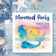 Invitation de mariage fantaisiste sur le thème de la mer, représentant une sirène aquarellée allongée sur la plage, profitant du coucher de soleil et d'une boisson tropicale avec une légende "Mermaid Party" en lettres style pinceau violet bleu. Œuvre de KL Stock