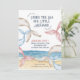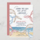 Invitation à la fête d'anniversaire Mermaid sur la plage intitulée "Venez nous rejoindre sous la mer, notre petite sirène a trois ans" - ou vous pouvez modifier pour n'importe quel âge que vous souhaitez. Aquarelle de saumon kéta muet neutre avec queues de sirène sur une scène de plage. Parfait pour une fête d'été, une fête de piscine, une fête de plage ou bien sûr une fête de sirène !