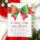 Merry Little red and green bow Christmas baby shower Invitation. This festive Christmas hbaby shower invitation is adorned with a prominent, impressive red and green bow covered with snow and with a snowflake at its center. The phrase "A Merry Little" is written in decorative typography. The reverse includes a playful pattern of varying red and green stripes, interspersed with charming snowflakes and snow.