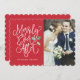 Faites passer l'amour tout en montrant vos photos de mariage cette saison de vacances avec ce Carte photo de vacances Juste Marié chic et moderne. Parfait pour le couple nouvellement marié à utiliser comme carte de vacances, faire-part mariage ou carte de remerciements autour de la saison des fêtes. Cette carte met en évidence votre photo mariage en l'associant à une typographie de script festive et ludique qui dit "Merrily Ever After" et accentuée par notre sainte aquarelle peinte à la main. Au verso, ajoutez votre propre message personnalisé et 3 photos supplémentaires.