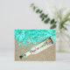Des vagues d'eau de mer lavant un message dans une bouteille sur la plage de sable brun. L'eau est turquoise caraïbe et le sable est de forme parties scintillant dorée. La personnalisation est facultative.