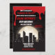 L'invitation incroyable est pour une soirée mystère de meurtre. Elle a le design d'une silhouette de paysage urbain et du sang qui coule sur la carte. En arrière-plan, il y a une pleine lune et des nuages rouges et blancs. Cela peut être utilisé pour n'importe quel type de soirée mystère de meurtre.