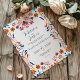 This Mexican Fiesta Floral Aesthetic Elegant Wedding Invitation design features a soft, textured cream background framed by an exuberant border of swirling floral and leaf motifs in vivid hues of red, orange, pink, teal, navy, and yellow. The symmetrical arrangement creates a harmonious and festive look, with floral bursts and elegant curves guiding the eye toward the center space. The overall aesthetic evokes a playful yet elegant celebration, perfect for weddings or joyous cultural events.