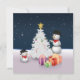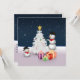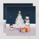 Illustration graphique hivernale et festive montrant deux mignons bonhommes de neige décorant le sapin de Noël avec des sucres de canne, des lumières de noël et une tête d'étoile.
