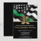 This design features a military flag with black and white stripes, and a thin green line stripe as well. The army boots and gold text sits above all of the party details for the graduating sergeant, captain, soldier, lieutenant or general's graduation party details.