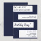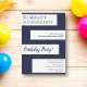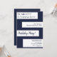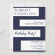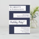 Cette invitation d'anniversaire élégante bleu marine et blanc est parfaite pour un anniversaire moderne. le design simple présente une calligraphie bleu marine élégante sur des bandes blanches sur un fond bleu marine.