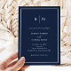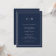 Ces invitations de mariage élégantes et modernes présentent un design minimaliste simple bleu marine et blanc, avec un cadre classique à la frontière. Ajoutez vos initiales ou votre monogramme pour les rendre complètement vôtres.