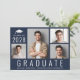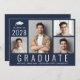 Faire-part moderne moderne de graduation en bleu foncé et invitation de fête avec un collage photo de 4 images, "Graduate" écrit en gros caractères blancs et son année de classe, nom et école ou université en simple typographie blanche. Ajoutez les détails de la partie à l'envers.
