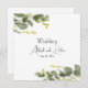 Invitación con diseño minimalista de vegetación y flores de mimosa de primavera con un efecto elegante y listo para personalizar, perfecta para una boda elegante y lujosa en la estación de primavera.