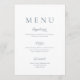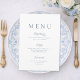 An elegant minimalist wedding menu card featuring refined typography and a soft dusty blue color palette. Designed in a timeless fine art style, this menu adds a sophisticated and cohesive touch to your wedding table setting.