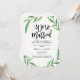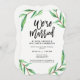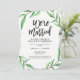 Ces invitations de mariage modernes de style minimaliste pour après la cérémonie présentent un fond blanc épuré avec des feuilles aquarelles vertes et une typographie noire.