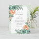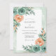 This design features a soft watercolor palette of mint green and peach. Delicate teal roses and lush peach peonies are accented by verdant eucalyptus leaves. The aesthetic evokes a serene and romantic spring atmosphere. The artwork focuses on soft painterly brushstrokes and organic floral arrangements.