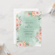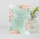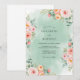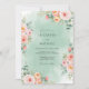 Delicate peach and blush roses intertwine with soft green foliage. A subtle watercolor wash in a serene mint green hue creates a romantic and airy atmosphere. The design evokes a sense of natural beauty and understated elegance.