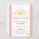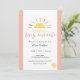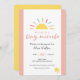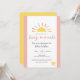 Apportez une touche de soleil à vos invitations pour la douche bébé avec cette invitation mignonne! Texte : "En attendant un petit miracle". Doté d'un soleil de dessin animé et d'étoiles et de couleurs vives jaune et rose avec une élégante typographie de script. Ce design moderne est facile à customiser avec les détails de la fête.
