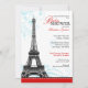 Invitations élégantes et modernes de douches pour bébés parisiennes avec une tour Eiffel à échelle grise au-dessus d'une bordure rouge avec des fleurs bleu aqua derrière.