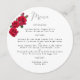 Modèle de menu mariage ronde avec design de roses rouges. Texte noir, sur cartes blanches, avec une formulation simple ajoutée à deux endroits. "Menu" en haut pour le titre, avec un paragraphe pour toutes les sélections de nourriture de réception. Retirez ou ajoutez des espaces si nécessaire. Trois roses rouges avec bourgeons décorent le bord supérieur gauche. Ce style est de 5,25 pouces de diamètre et est aussi en forme carré. Cette conception peut être achetée en téléchargement immédiat.