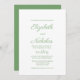 le design d'avant montre une faire-part de mariage écrite en calligraphie et typographie vert classique avec arrière - plan blanc. le design est parfait pour élégant, classique, unique, moderne thème mariage.