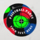 Invitation modèle pour une fête avec éclaboussures de paintball rondes. Cartes d'invitation pour une fête à thème pour l'anniversaire des enfants, un événement en entreprise, une sortie en famille, etc. Texte personnalisé et couleurs de fond avec un design de viseur. Modèle de design amusant et coloré avec une typographie en gras. Design en forme de cercle avec des impacts de peinture. Créez des invitations circulaires pour les enfants et les adultes. Cartes d'invitation personnalisées pour les amis et la famille. Également amusant pour les adultes. Impression recto-verso.