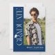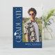 Celebrate your graduate in timeless, elegant style with this modern blue and white graduation invitation. Set against a stylish blue background, the design features trendy white serif “GRADUATE” typography running vertically down the side, creating a refined focal point. A stylish graduation cap icon sits above the “R,” while the flowing tail of the letter transforms into a sleek tassel—leading the eye to a standout photo of the graduate.