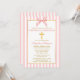 Modern Elegant Pink Blush Striped First Holy Communion Invitation includes Pink and White Stripes, Gold Frame, Gold Cross and Pink Bow Ribbon.