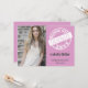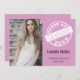 Ce design d'invitation à la remise des diplômes de photographie girly moderne présente un cercle blanc comme un timbre avec la typographie blanche qui dit "classe de" et l'année de remise des diplômes. Couleur arrière - plan rose et texte blanc et gris. Ajoutez simplement la photo, le nom et l'année de diplôme du diplômé. Remplir toutes les informations de la partie au verso de la carte. Conception géniale pour une invitation à une fête de fin d'études secondaires ou collégiales. D'autres couleurs arrière - plans sont également disponibles dans notre boutique.