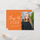 Invitations modernes de la fête de remise de diplômes mettant en vedette "Classe de 2023" dans une écriture manuscrite blanche sur un arrière - plan orange. Personnalisez l'avant de l'invitation de diplôme en ajoutant le nom du diplômé, le nom de l'école et la photo verticale. L'invitation inverse pour afficher les détails de votre fête de remise de diplômes en lettres blanches sur un arrière - plan orange.