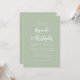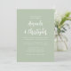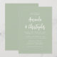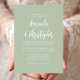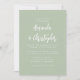 This simple modern wedding invitation features white text on a sage green background. Add the names of the bride and groom in stylish handwriting calligraphy and the details in sans serif font. The reverse side is a matching shade of solid sage green.