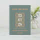 Moderne Blue Grey et Terracotta Enregistrer la carte Date Un mariage moderne Enregistrer la date avec un design élégant et un élégant script blanc et en terre cuite. Les noms de couleur exacts sont Cutty Sark (gris bleuté) et Raw Sienna (terre cuite). Personnalisez avec les détails de votre événement.