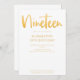 Introduisez une nouvelle invitation moderne et élégante à la fête du 19e anniversaire avec un arrière - plan blanc classique avec texte de typographie manuscrite en or qui dit dix-neuf". Customisez cette carte de modèle en ajoutant vos propres informations de fête.