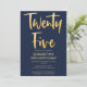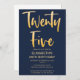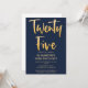 Introduisez une nouvelle invitation moderne et élégante à la fête du 25e anniversaire, arrière - plan bleu marine avec texte de typographie manuscrit en or "vingt-cinq". Customisez cette carte de modèle en ajoutant vos propres informations de fête.