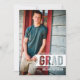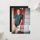 Un design simple et moderne qui présente la photo de votre diplômé sur le devant avec tous les détails de la fête ou de la faire-part sur le dos. Design de typographie contemporaine et tendance, avec une touche masculine. Couper la bannière de votre photo pour la regarder à travers ajoute un côté moderne. Un faire-part décontracté, mais sophistiqué qui met en valeur votre fils et sa célébration de graduation.