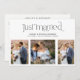 Faire-Part de Réception de Mariage avec 4 Photos - Annoncez votre mariage après votre évasion ou cérémonie privée, et invitez vos invités à votre réception, avec cette carte d'invitation moderne de réception uniquement après la célébration de mariage avec 4 photos. Avec trois photos verticales sur le devant et une photo horizontale au dos, ce design vous offre de nombreuses options. "just married" apparaît en haut de la carte dans une typographie cursive minuscule noire fraîche et décontractée, suivie en dessous de vos noms, date et lieu, dans une police moderne sans empattement élégante. Tous les champs de texte sont entièrement personnalisables - la couleur, la police, la taille et le texte peuvent être modifiés pour répondre à vos besoins. Le dos de la carte comporte toutes les informations d'invitation. Copyright Anastasia Surridge Designs, tous droits réservés.