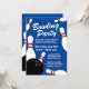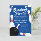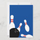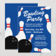 Moderne modèle d'invitation pour une fête d'anniversaire de bowling. Invitations cool avec des boules de bowling noires et des quilles blanches. Personnalisez avec votre propre nom et texte. Activité amusante pour les enfants et les adultes. Fond bleu ou couleur personnalisée. Allons nous amuser !