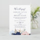 Cette invitation de réception de fiançailles florales nautiques modernes est parfaite pour une croisière ou une fête post-mariage sur la plage. Le design fantaisiste présente des fleurs aquarelles rose blush et bleu marine avec des accents d'étoiles de mer dorées, lui donnant une ambiance balnéaire. Les cartes de RSVP sont vendues séparément, ou vous pouvez ajouter les informations de RSVP au verso de la carte.