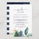 Cette carte d'invitation moderne de renouvellement de vœux nautiques avec feuillage est parfaite pour une cérémonie et une célébration de renouvellement de vœux sur la plage. Le design botanique présente de belles feuilles vertes avec des fleurs bleues marine et des accents d'étoiles de mer dorées, lui donnant une ambiance balnéaire.