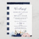 Cette invitation de réception de mariage intime florale nautique moderne est parfaite pour une croisière ou une fête post-mariage sur la plage. Le design fantaisiste présente des fleurs aquarelles rose blush et bleu marine avec des accents d'étoiles de mer dorées, lui donnant une ambiance balnéaire. Les cartes de RSVP sont vendues séparément, ou vous pouvez ajouter les informations de RSVP au verso de la carte.