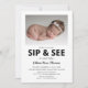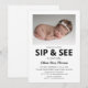 Invitation minimaliste pour une fête sip and see avec un fond blanc, une photo et un modèle d'invitation moderne facile à personnaliser. Tous les styles et tailles de police peuvent être facilement modifiés en cliquant sur le lien 'personnaliser davantage' après la personnalisation.