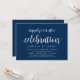 Carte d'invitation à thème Moderne Rustique, Écriture Bleu Marine (avec titre de carte : Célébration de bonheur éternel). Elle est parfaite pour votre réception de mariage en intime / fête de célébration après le mariage. Ajoutez vos détails dans une police / lettrage noir assorti.