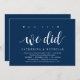 Carte d'invitation sur le thème Moderne Rustique, Écriture Bleu Marine (avec titre de carte : oh oui, nous l'avons fait). Elle est parfaite pour votre réception de mariage en intime / fête de célébration post-mariage. Ajoutez vos détails dans une police / lettrage noir assorti.