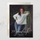 Cette invitation à la graduation moderne comporte une photo verticale qui remplit l'intégralité de l'avant de la carte et une deuxième photo fanée sur le dos. Un script d'écriture moderne apparaît sur la photo qui dit '23 diplômé. Le texte personnalisé vous permet d'ajouter le nom et l'école du diplômé sur l'invitation avant et de la fête à l'arrière.