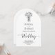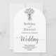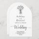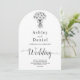 Cette élégante faire-part de mariage en arc noir et blanc est parfaite pour un mariage moderne. Le design simple présente une élégante calligraphie noire et une illustration de mariée et de mariée sur un arrière - plan blanc propre. La carte d'invitation comprend les détails du mariage au dos au lieu de payer une carte d'enceinte séparée.