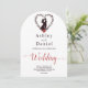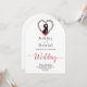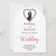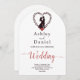 Cette élégante faire-part de mariage en arc noir et blanc est parfaite pour un mariage moderne. Le design simple présente une élégante calligraphie noire et une illustration de mariée et de mariée sur un arrière - plan blanc propre. La carte d'invitation comprend les détails du mariage au dos au lieu de payer une carte d'enceinte séparée.