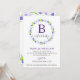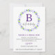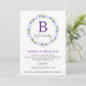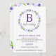 Un "B" grand, monogrammé et violet est placé dans une couronne de fleurs de couleur douce pour notre B est pour Baby Baby Shower Invitations.