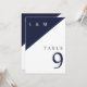 Ces numéros de table de mariage minimalistes bleu marine et blanc peuvent être personnalisés avec vos informations dans la typographie moderne. Conçu par Thisisnotme©